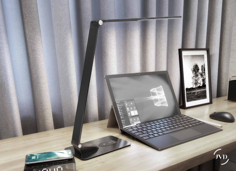 Beacon desk lamp, energy-saving LED white & warm lighting, wireless & USB charging, light dimming, adaptor included, size H420/L385/W120mm, black color