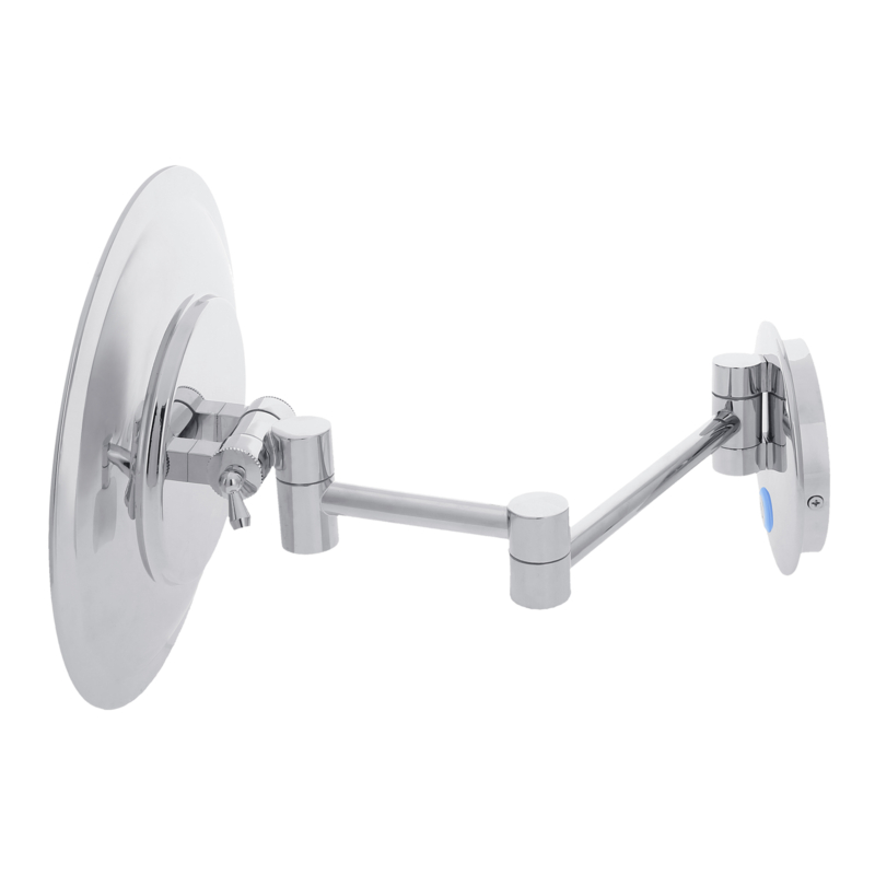 Celeste illuminated round mirror with tubular chrome brass arm with 2 lighting options: warm or cold white