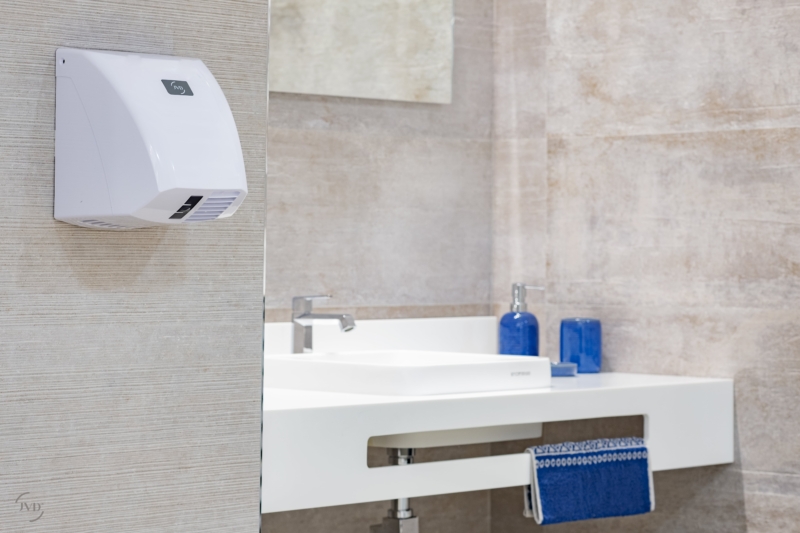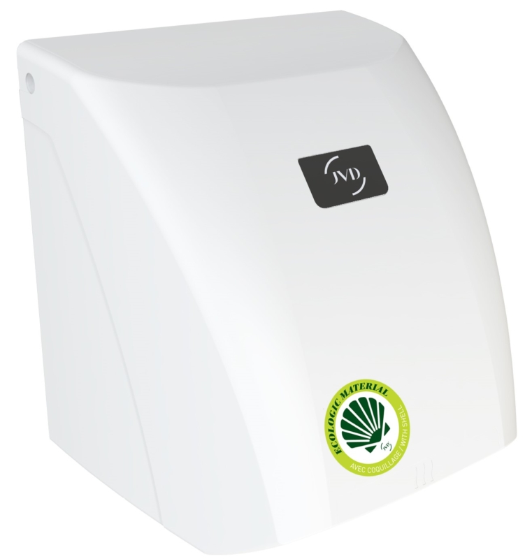 White Zephyr hand dryer made from biobased materials, hot air hand dryer, anti-vandalism (IK10) with customizable logo. 3 years warranty