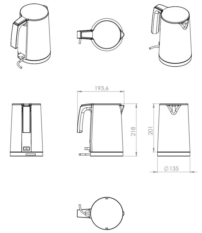 Divine kettle 1.0L, 220V-240V 1360W, double-wall; outer metal & internal S/S304, S/S brushed