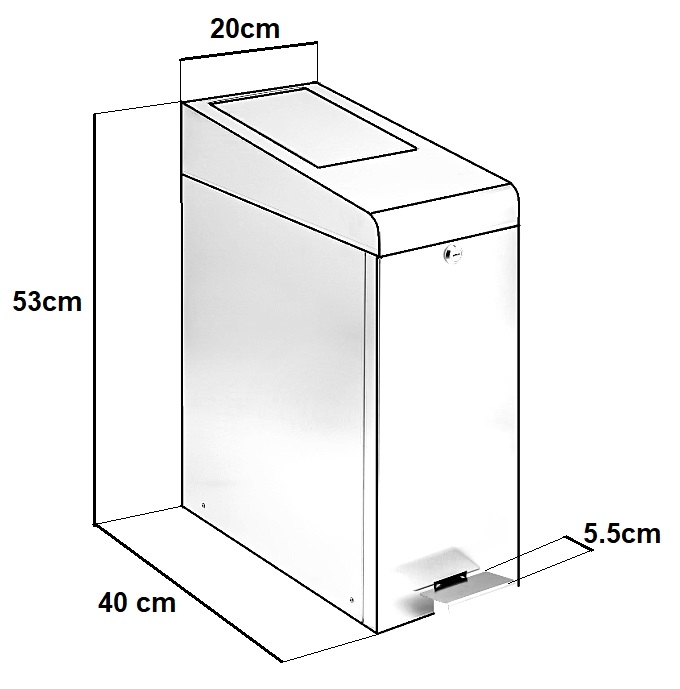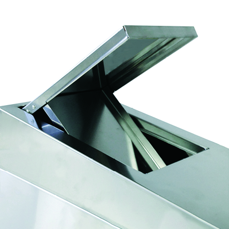 Large-capacity (45L) brushed 304 stainless steel feminine hygiene bin with pedal-operated trapdoor to conceal the interior.