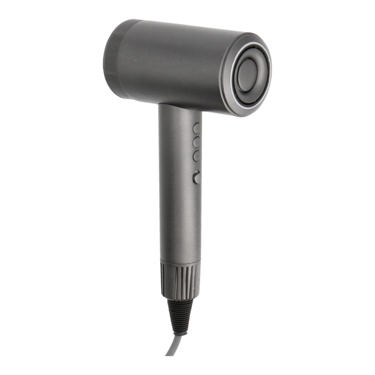 Thalos High Speed Hair Dryer 1875W: Ultra-quiet (62dB), 110,000 RPM brushless motor dries hair fast with 22m/s airflow. 4 settings (3 heat + cool shot) for all hair types; 200M ions reduce frizz. Dual air inlets prevent overheating; overheat protection + Class II safety. Lightweight (0.45kg), 1.8m cable, magnetic nozzle, LED display. Premium grey design for hotels.