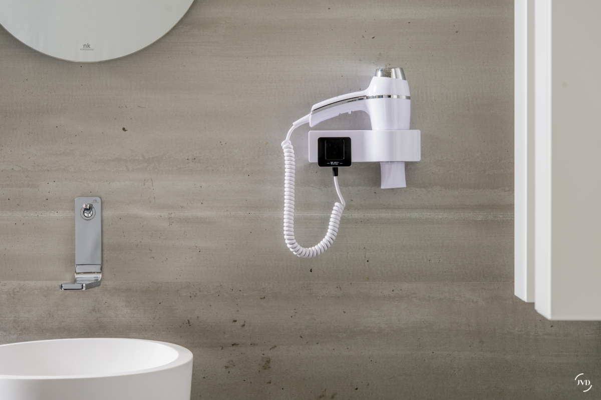 Secador de pelo ATEO negro + soporte con toma de afeitar MonoTension 230V, 1875W, activación con un manejo sencillo gracias a su empuñadora patentada LighTouch. 6 configuraciones de secado y equipado con un sistema ionizante.Instalación en volumen 3.