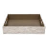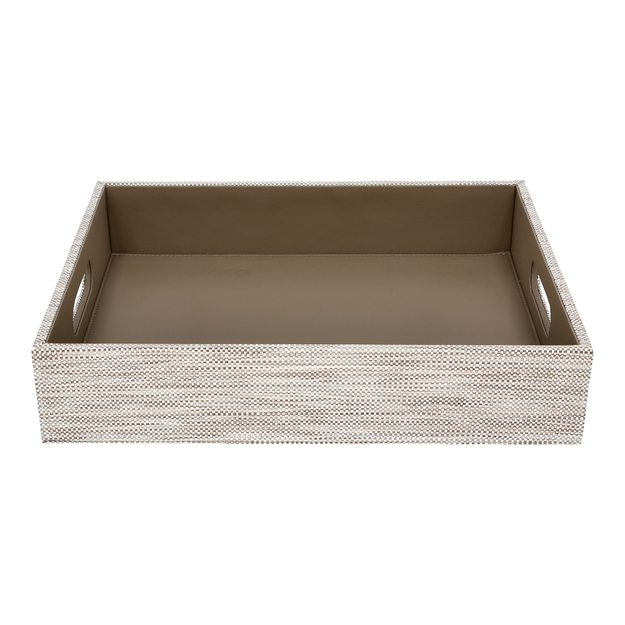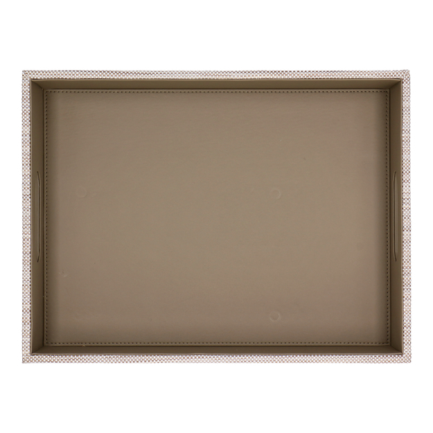 Bandeja con asas Adesign Tribe: diseño refinado con interior en polipiel oliva y exterior tejido en polipropileno gris-beige. Resistente al agua y práctica, combina elegancia y funcionalidad para un servicio impecable.