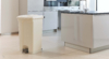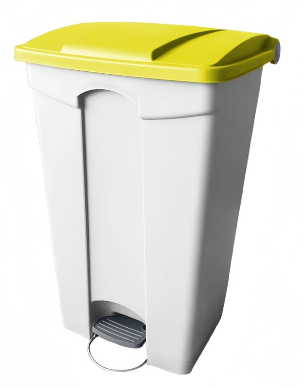 Contenedor 90L blanco con tapa amarilla a pedal, con anillo de estabilidad y ruedas de transporte. Cierre automático de la tapa e incluye adhesivos para reciclaje selectivo.