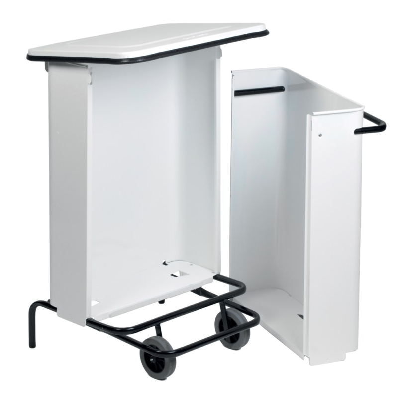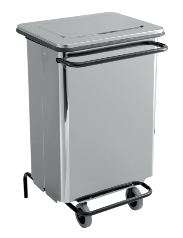 Contenedor móvil de 70L en acero inoxidable brillante con pedal y asa en acero con recubrimiento epoxi. Apertura frontal para facilitar la evacuación de la bolsa de residuos.