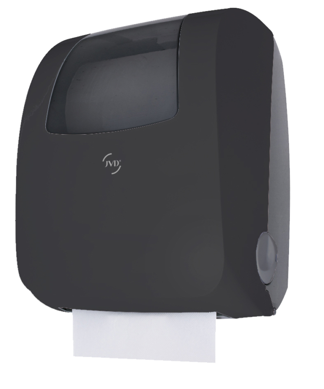 Cleantech negro mate – Dispensador de papel robusto y polivalente. Compatible con la mayoría de bobinas estándar (Ø máx.: 216 mm, ancho máx.: 210 mm, mandril 38–51 mm), se adapta a cualquier entorno. Su corte automático permite una dispensación fácil e higiénica. Fabricado en material anti-golpes, es duradero y fiable. El rodillo antiestático evita atascos, y la cerradura integrada protege el contenido.
