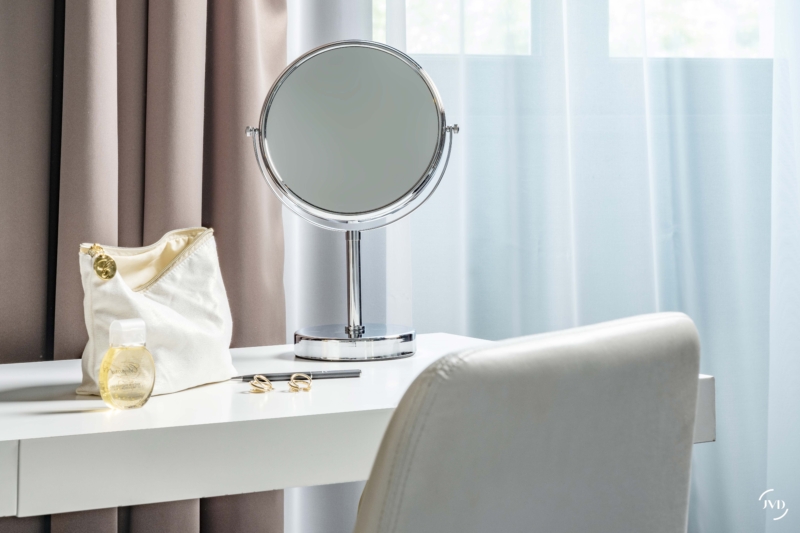 Espejo Fiesta cromado mural de doble cara (normal y aumento x3) con brazo tubular de latón cromado.