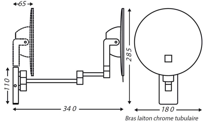 Espejo ECLIPS redondo iluminado con brazo tubular, con aumento x3. Funciona con 1 pila de litio de 3,6 V incluida, lo que permite una instalación sin conexión eléctrica. El espejo cuenta con temporizador de 3 minutos. Brazo tubular de latón cromado, 3 articulaciones. Encendido mediante sistema táctil.
