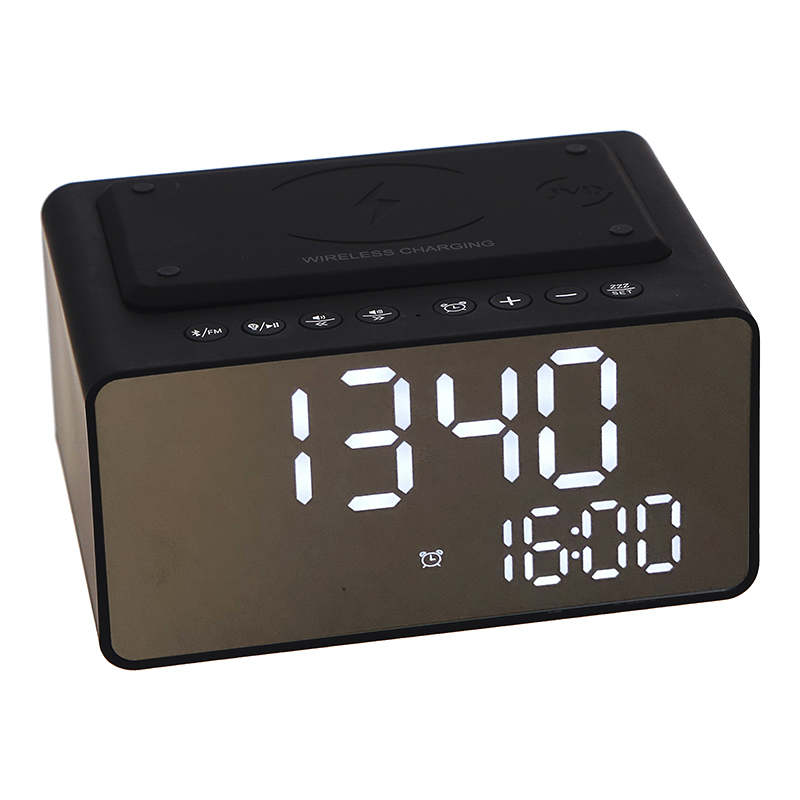 Despertador estéreo Wave, carga inalámbrica y USB, entrada AUX, Bluetooth, radio FM, atenuación de la luz. Diseñado para hostelería: alarma única, repetición, funcionamiento con batería en caso de corte de alimentación. Cable antirrobo opcional.