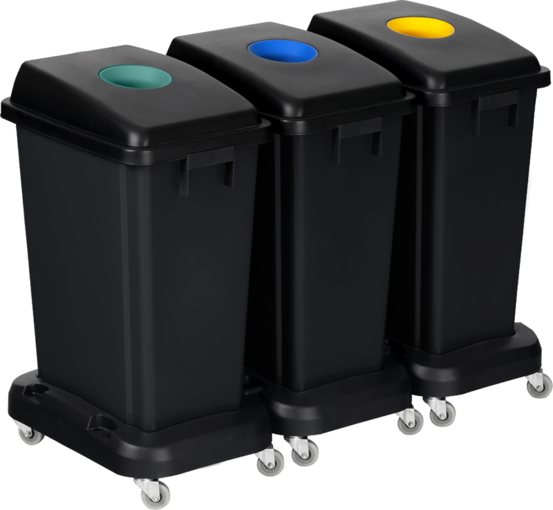 Lote de 3 contenedores de clasificación selectiva de 60L. Tapas de apertura redonda en colores verde, azul y amarillo. Carrito incluido para facilitar el traslado. Fabricado con 100% plástico reciclado.