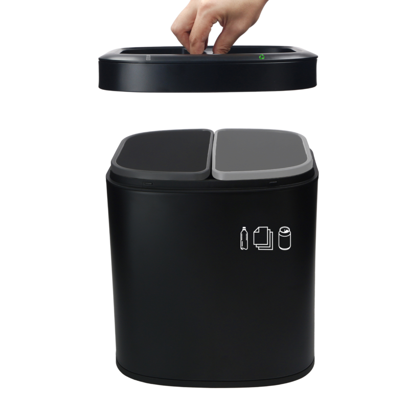 Papelera de reciclaje ovalada con 2 compartimentos y tapa que permite ocultar la bolsa de basura