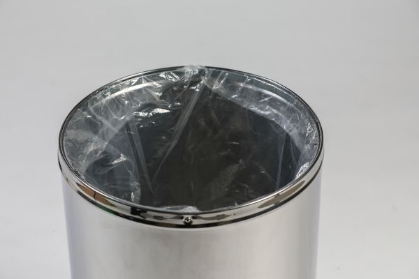 Papelera Push 40L en acero inoxidable pulido espejo, equipada con tapa basculante en acero inoxidable silenciosa montada sobre resorte y con soporte para bolsa que mantiene los residuos fuera de la vista. Un anillo de caucho alrededor del borde inferior protege el suelo de los arañazos y la papelera de los productos químicos.