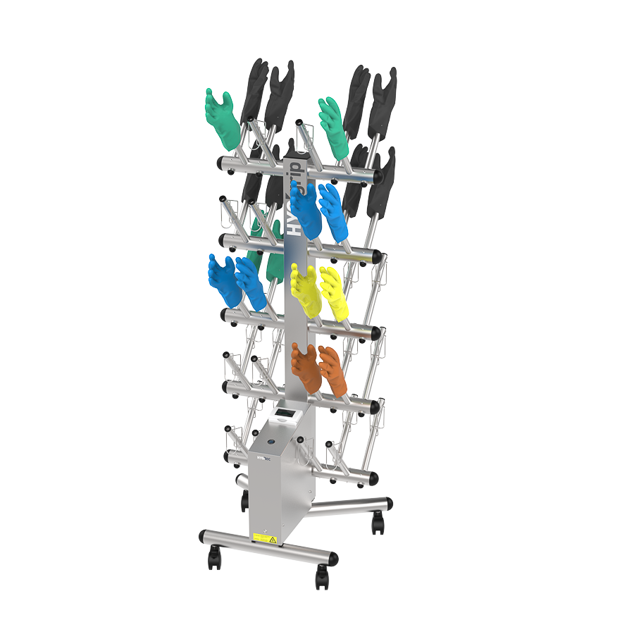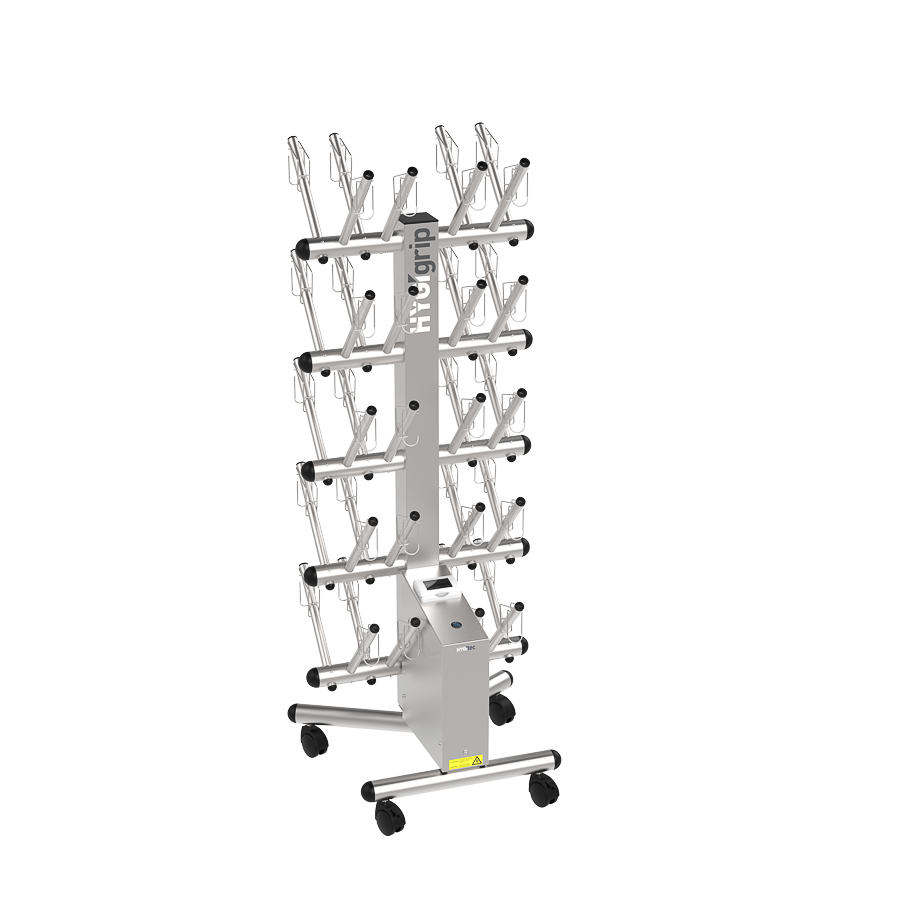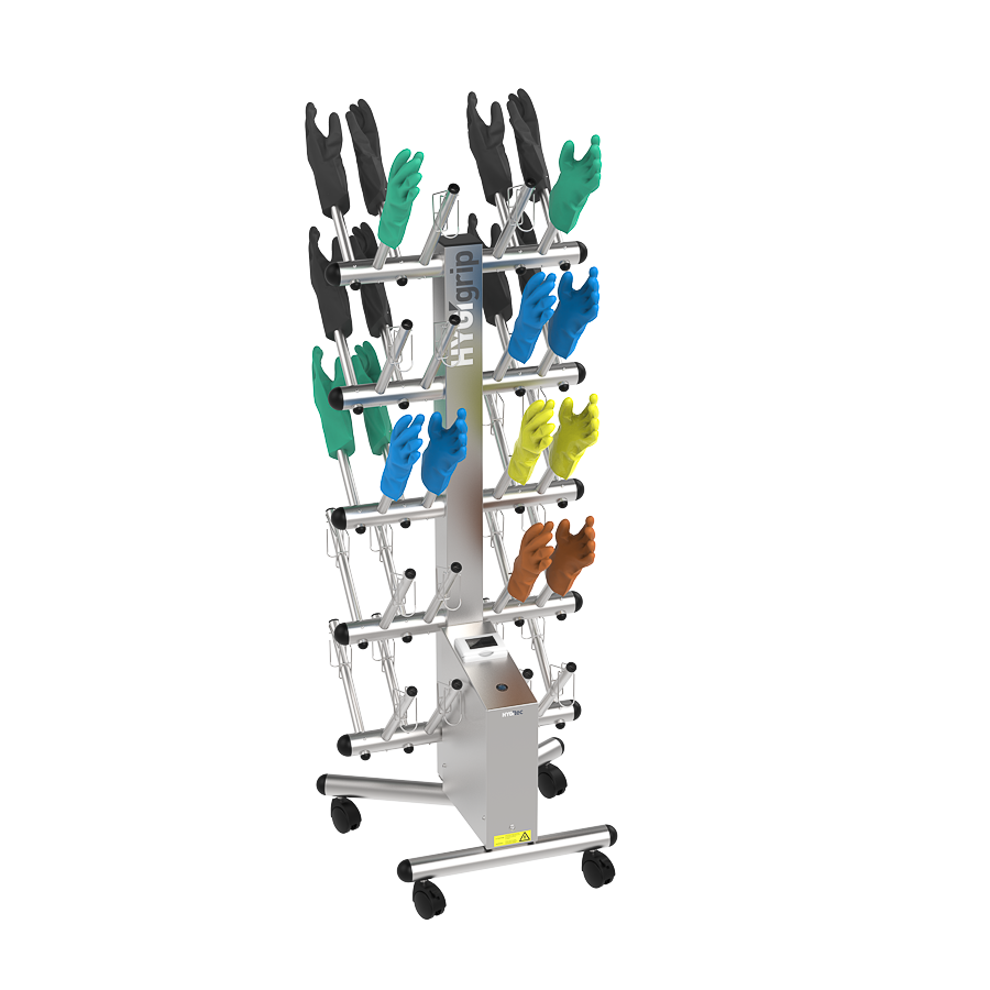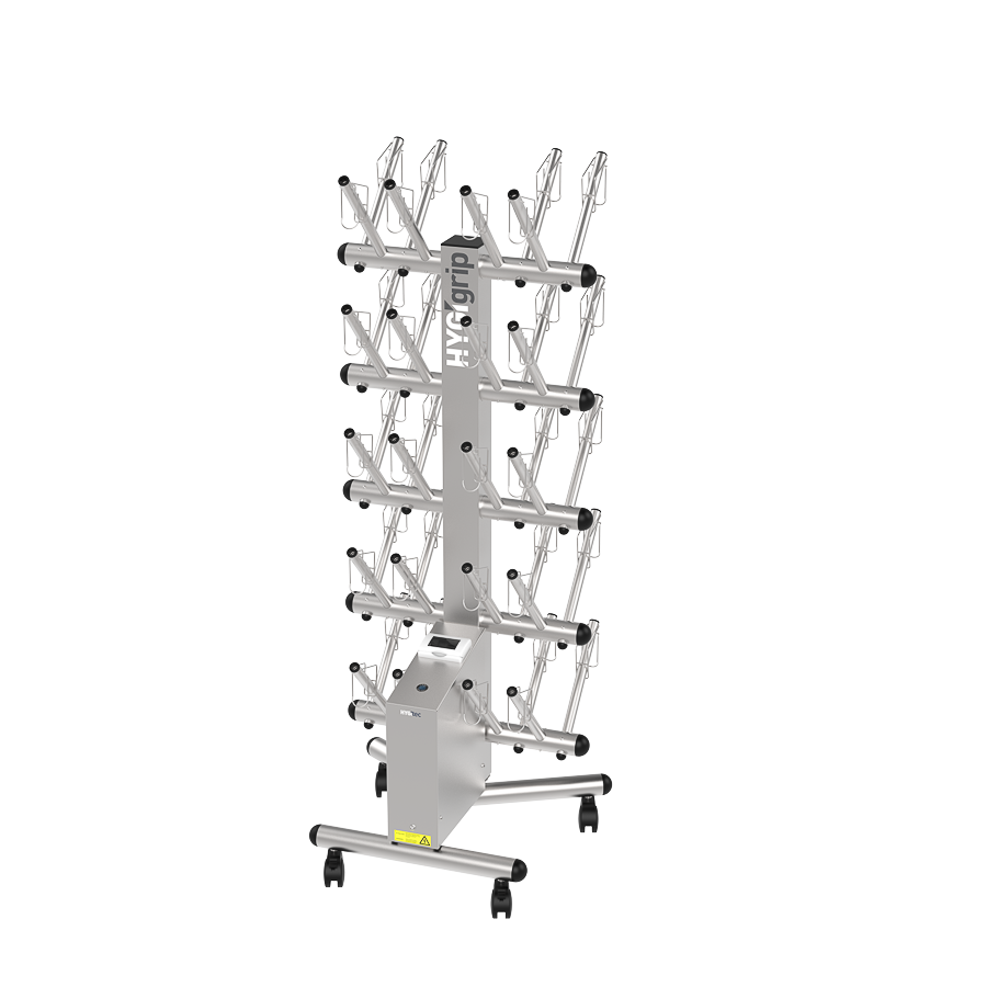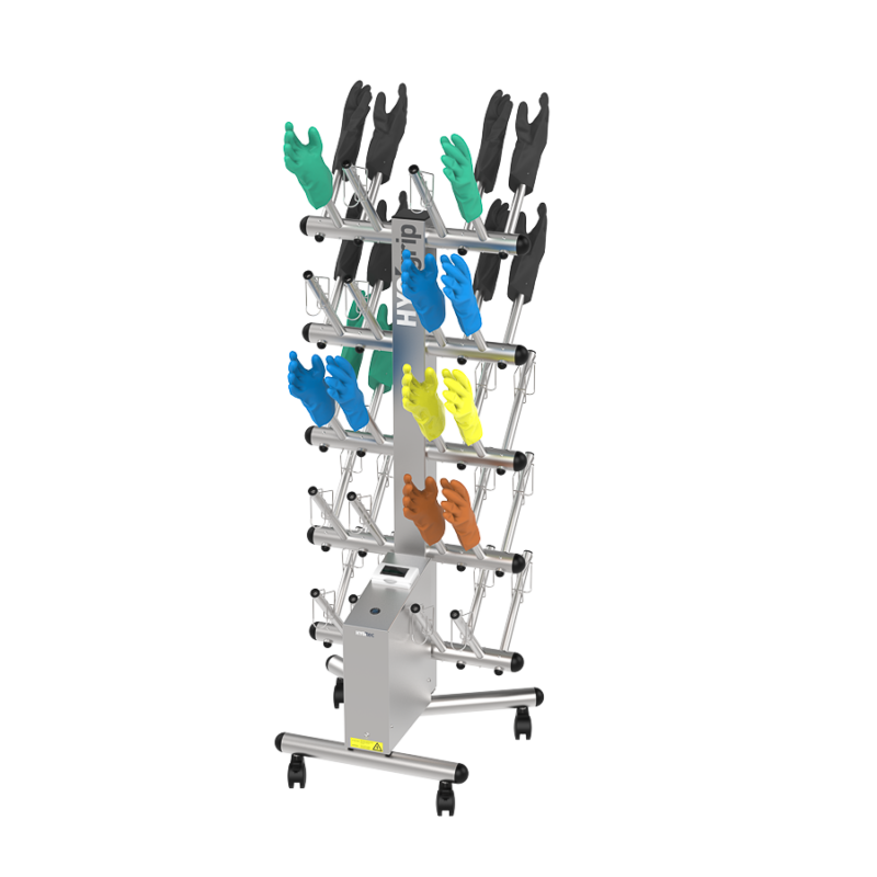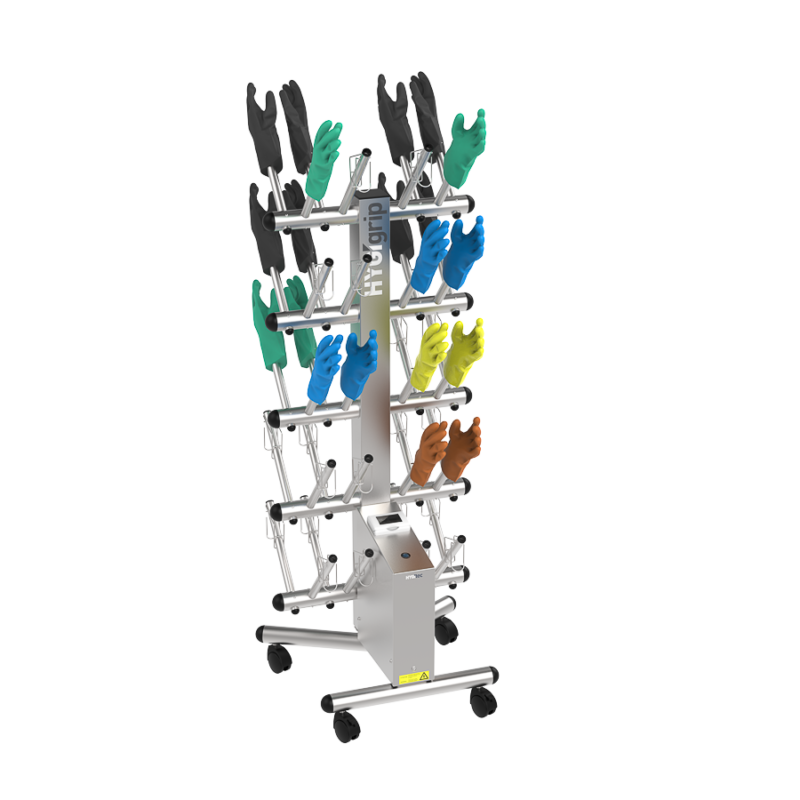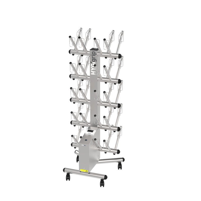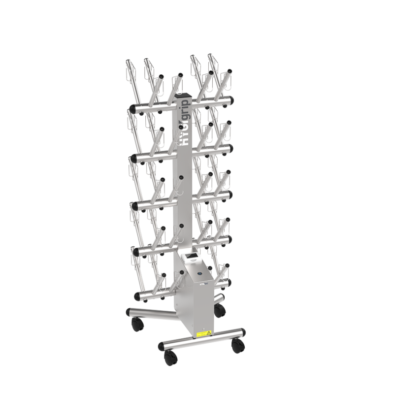 Secador de guantes HYGIgrip para 20 pares, de doble cara, en acero inoxidable 304L. Desinfecta sin químicos todo tipo de guantes. Equipado con manguitos específicos y 4 ruedas giratorias. Compacto, robusto y eficaz.