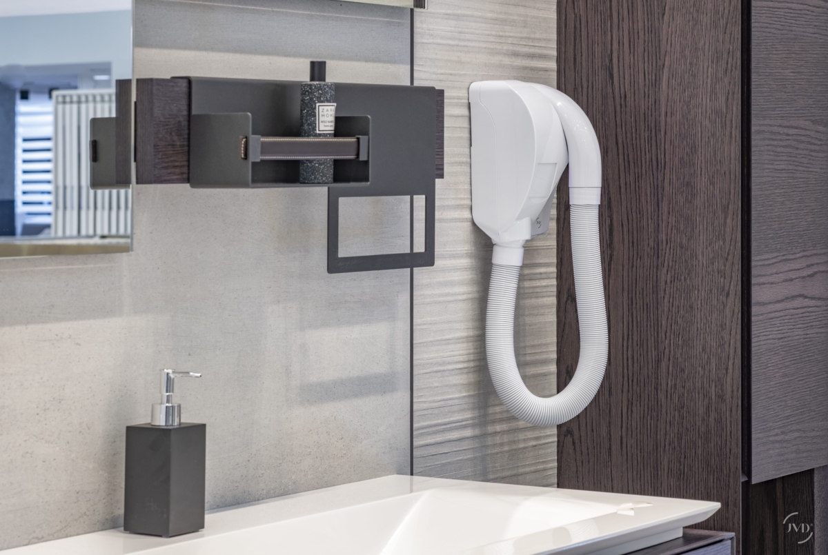 Secador de pelo Caraïbe con toma para afeitadora Monotensión 230 V y temporizador de seguridad de 15 min. Potencia 1000 W, manguito patentado para facilitar el peinado. Instalación en volumen 3. Garantía de 3 años.