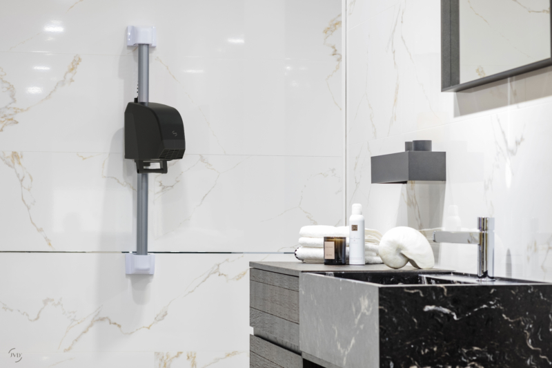 Secador de pelo Neptune negro mate para piscinas y gimnasios, resistente a ambientes clorados y equipado con motor de inducción para uso intensivo. Altura regulable y ergonómico (giro de 180°). Garantía de 3 años.