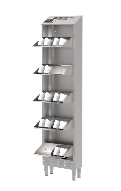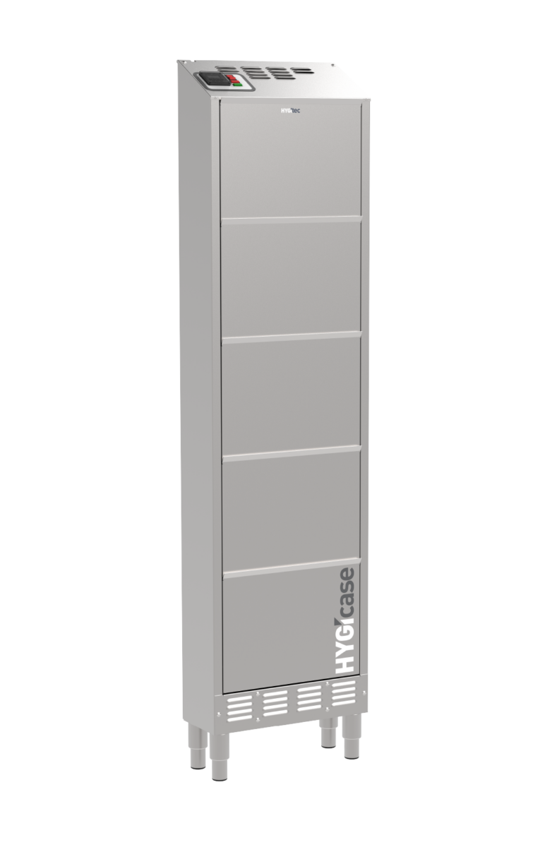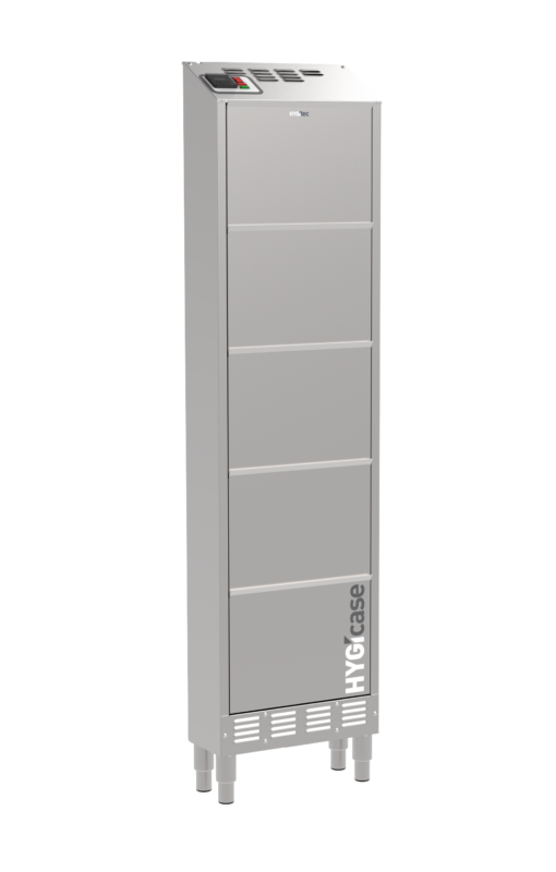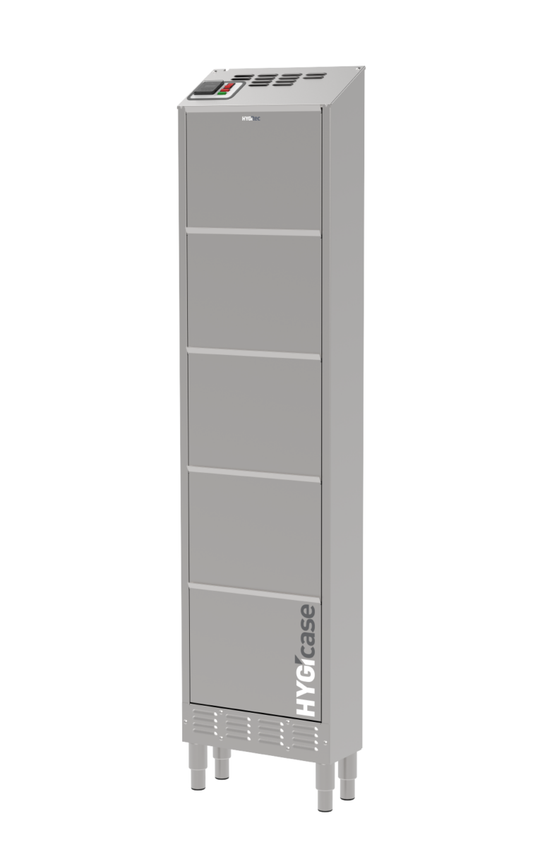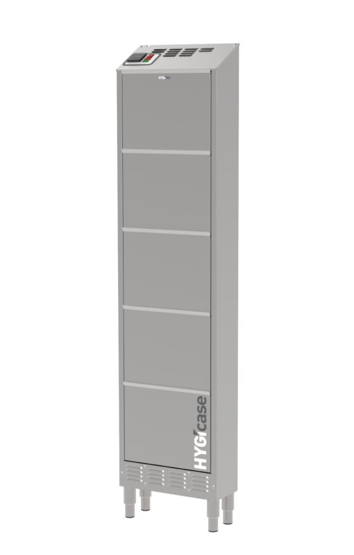 Compacto y fabricado completamente en acero inoxidable, HYGIcase cuida hasta 10 pares de zapatos bajos mediante un secado rápido, desinfección eficaz y desodorización sin productos químicos. Su tecnología elimina los microorganismos tanto en el interior como en el exterior del calzado. Gracias a su diseño ultraoptimizado, ocupa un espacio mínimo: solo 20 cm de profundidad.