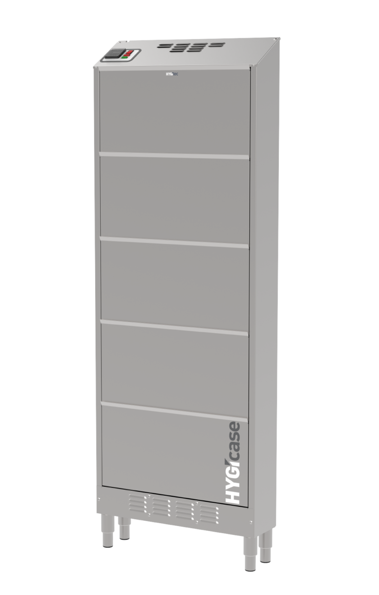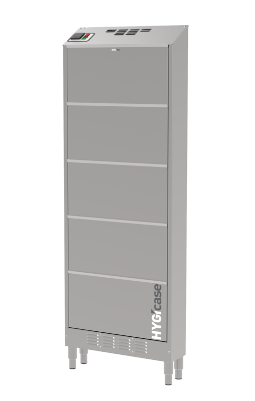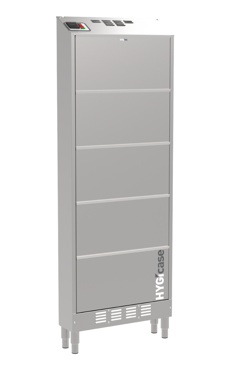 Compacto y fabricado completamente en acero inoxidable, HYGIcase cuida hasta 15 pares de zapatos bajos mediante un secado rápido, desinfección eficaz y desodorización sin productos químicos. Su tecnología elimina los microorganismos tanto en el interior como en el exterior del calzado. Gracias a su diseño ultraoptimizado, ocupa un espacio mínimo: solo 20 cm de profundidad.