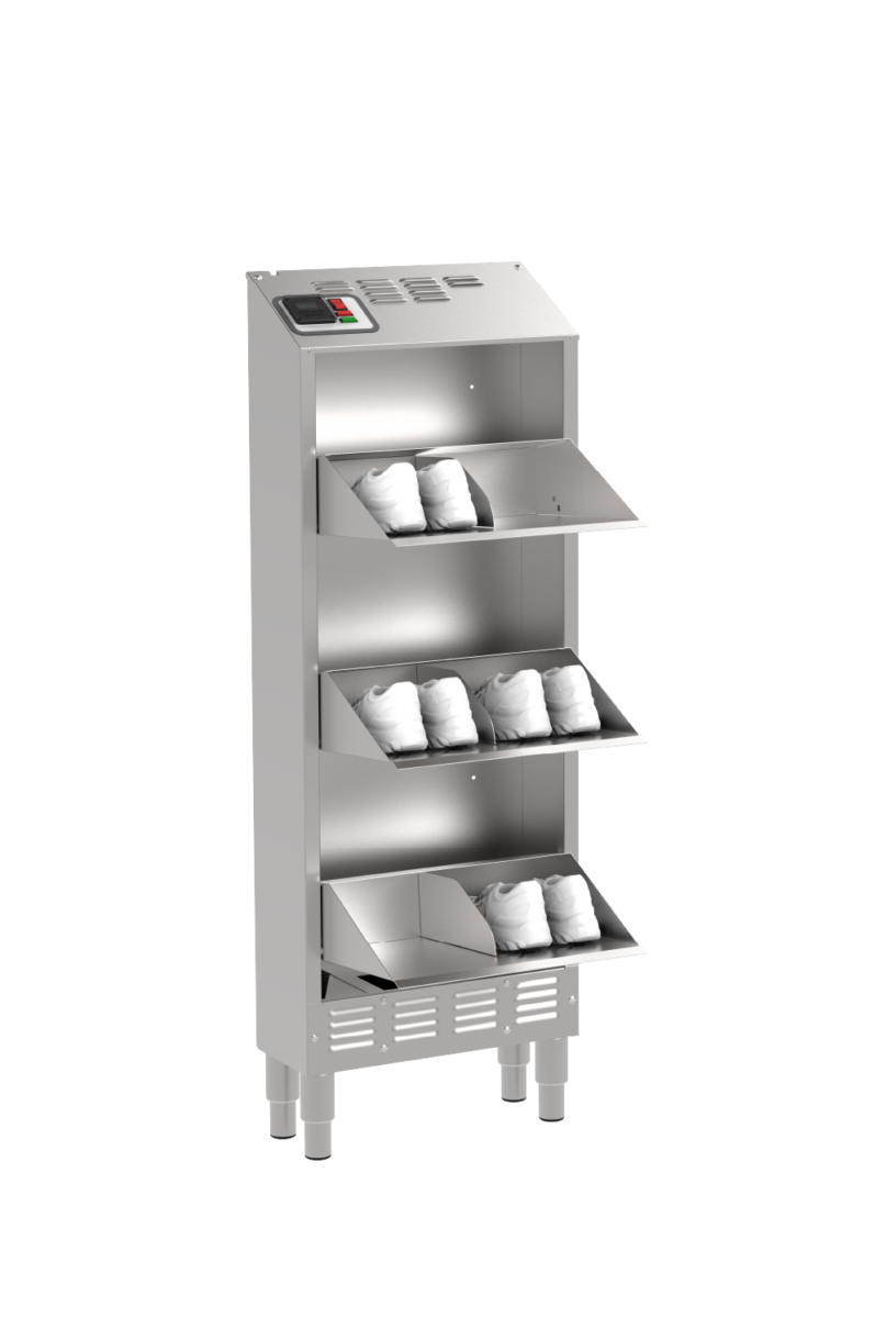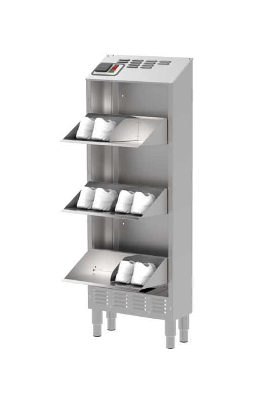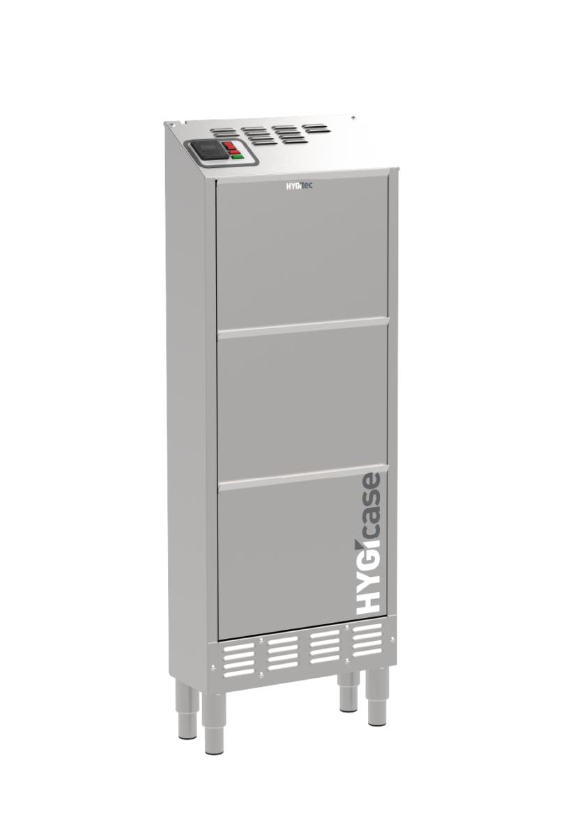 Compacto y fabricado completamente en acero inoxidable, HYGIcase cuida hasta 6 pares de zapatos bajos mediante un secado rápido, desinfección eficaz y desodorización sin productos químicos. Su tecnología elimina los microorganismos tanto en el interior como en el exterior del calzado. Gracias a su diseño ultraoptimizado, ocupa un espacio mínimo: solo 20 cm de profundidad.