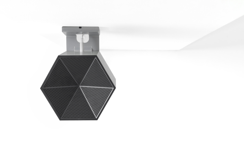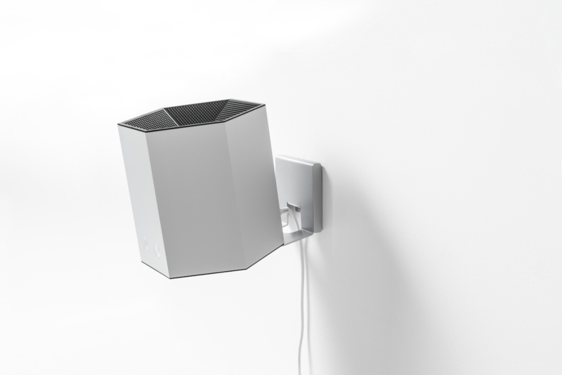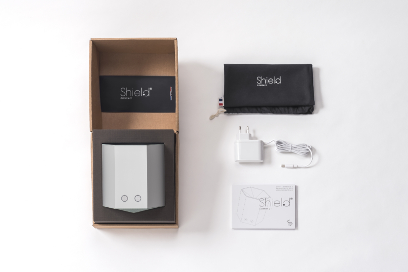 Purificador de aire personal Shield Compact Negro Mate con soporte mural, fabricado en Francia, eficaz contra todas las partículas nocivas presentes en el aire. Verdadera burbuja de protección individual, el purificador de aire profesional Shield Compact© protege la salud y el confort de cada persona.