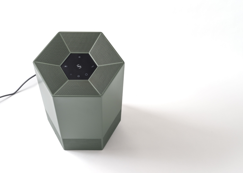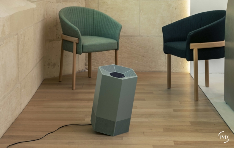 Purificador de aire profesional Shield Verde Malaquita, fabricado en Francia, conforme a la norma NF B44-200, cubriendo una superficie de hasta 60 m².